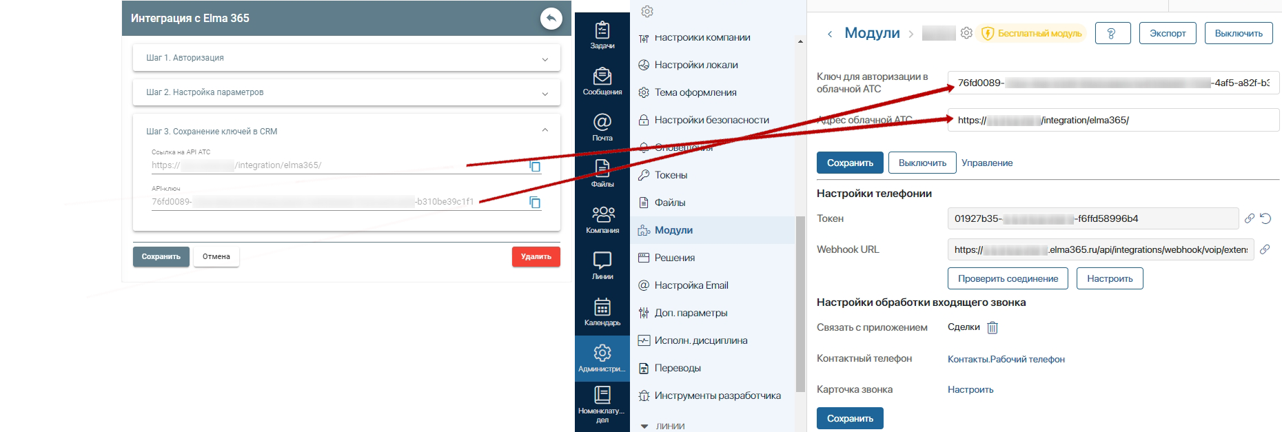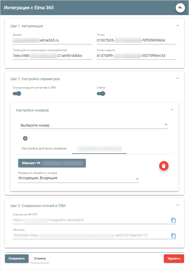 Скопируйте значение из поля «Ссылка на API ATC» в ЛК и вставьте его в поле «Адрес облачной АТС» на странице Elma365. Скопируйте значение из поля «API-ключ» в ЛК и вставьте его в поле «Ключ для авторизации в облачной АТС» на странице Elma365.