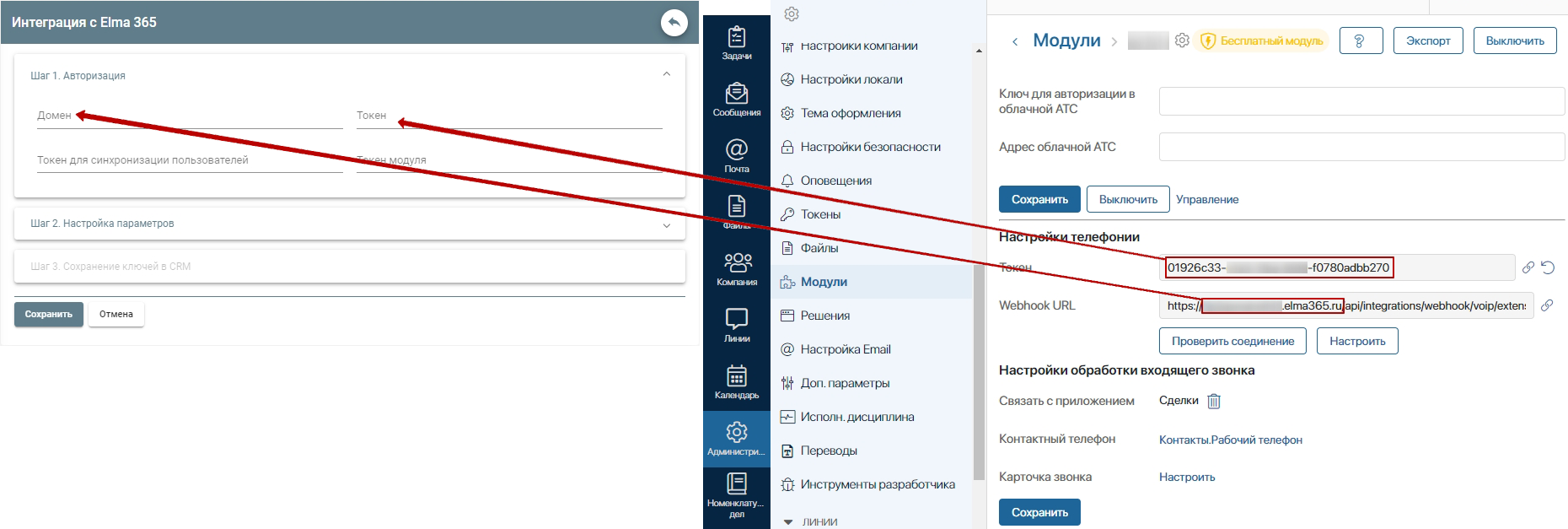 В поле «Домен» в ЛК вставьте выделенную на скрине часть значения из поля «Webhook URL» страницы Elma365. В поле «Токен» в ЛК вставьте значение из поля «Токен» страницы Elma365.