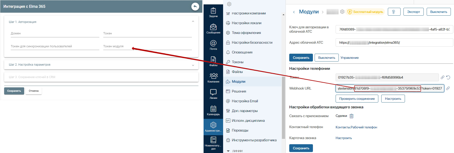 Выделите на странице Elma365 поле «Webhook URL» и переместите курсор вправо, до extension/. Скопируйте часть значения от extension/ до ?token и вставьте её в поле «Токен модуля» в ЛК.