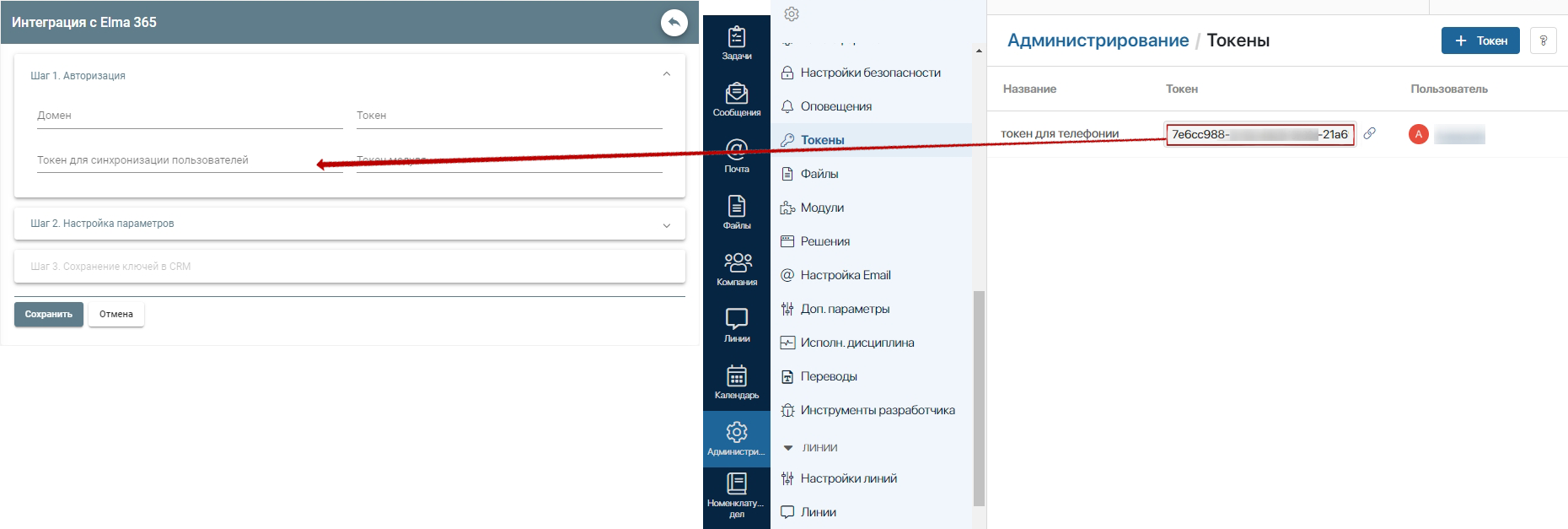 На странице Elma365 перейдите в раздел «Администрирование», подраздел «Токены». Скопируйте ранее созданный токен в поле «Токен для синхронизации пользователей».