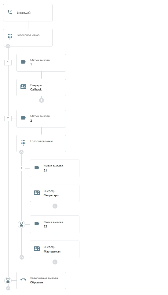 Тоже самое сделайте и для второй ветки, но в «Значение» укажите «2». После добавьте ещё одно Голосовое меню с двумя ветками, на каждую из которых также повесьте элемент Метка вызова. На этот раз в «Значение» укажите «21» и «22» соответственно. Затем дополните маршрут так, как Вам необходимо.