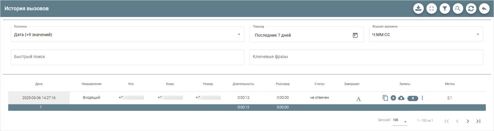 Если воспользоваться фильтром «Статус», выбрав в нем «Не отвечен», то можно будет собрать статистику по неотвеченным вызовам на конкретных ветках.
